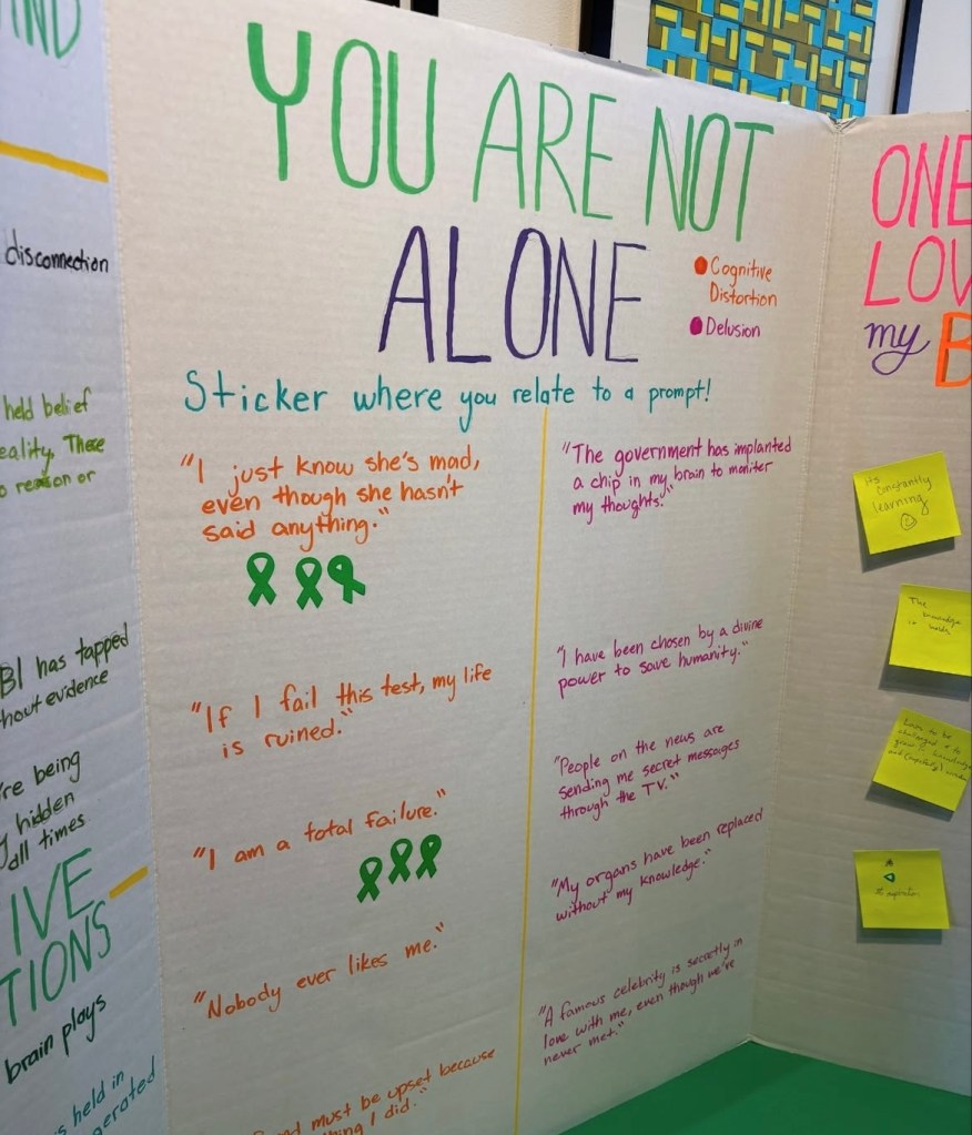 This board reminded visitors that while delusions are a clinical symptom, some of the thinking errors behind them exist on a spectrum that many people experience. The activity became a point of connection, not separation.